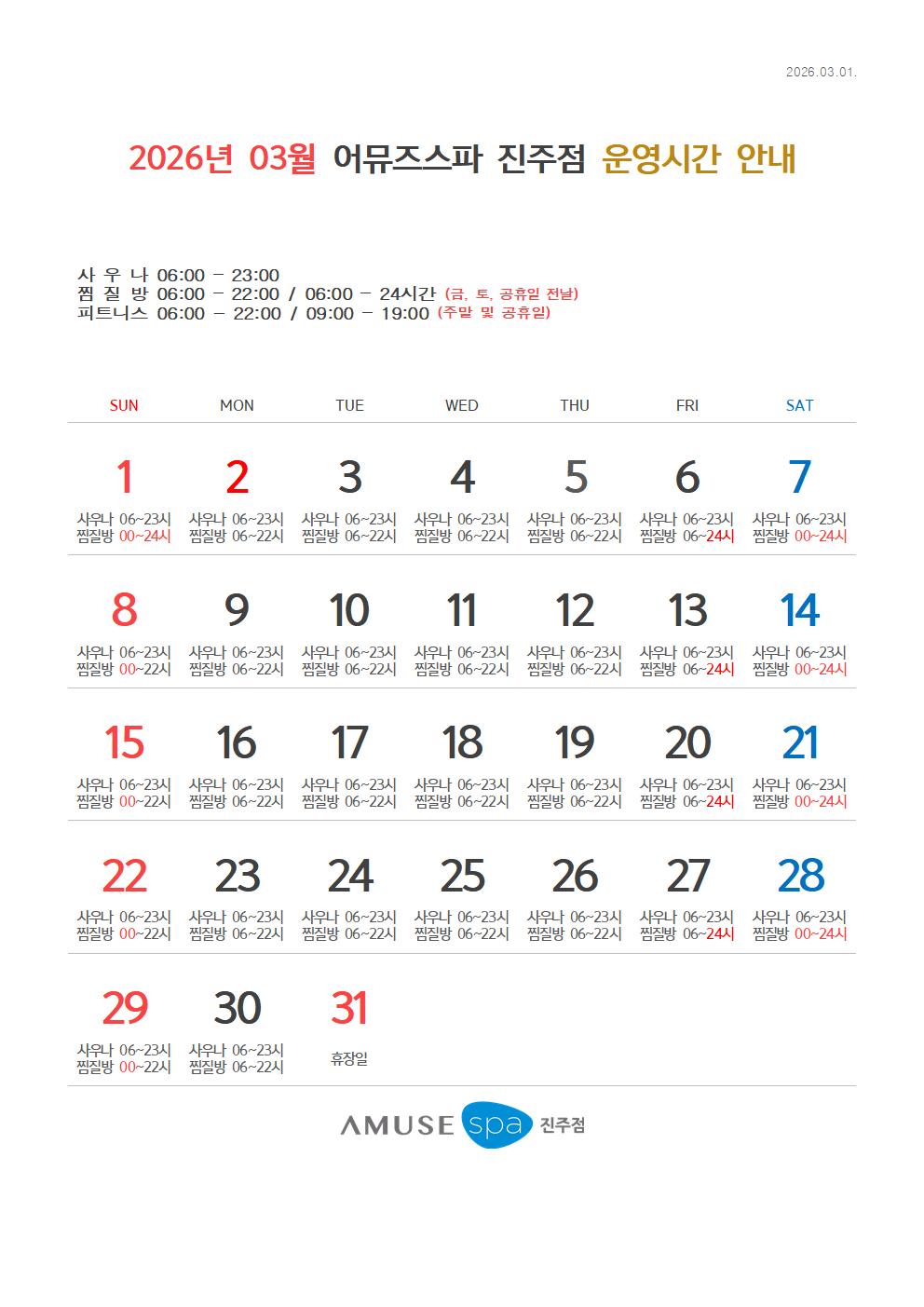 2026년 3월 어뮤즈스파진주점 운영시간 안내