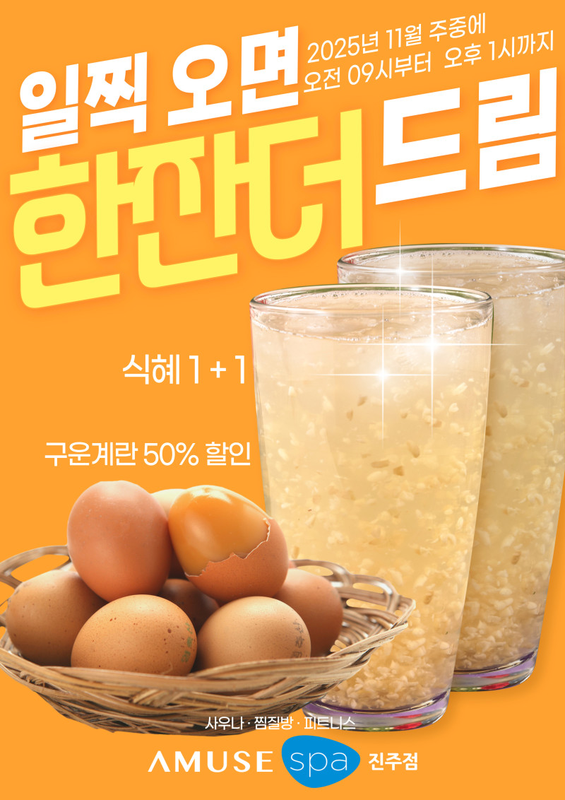 어뮤즈스파진주점 11월 주중 오전 방문 혜택(식혜1+1, 계란반값 이벤트) 안내